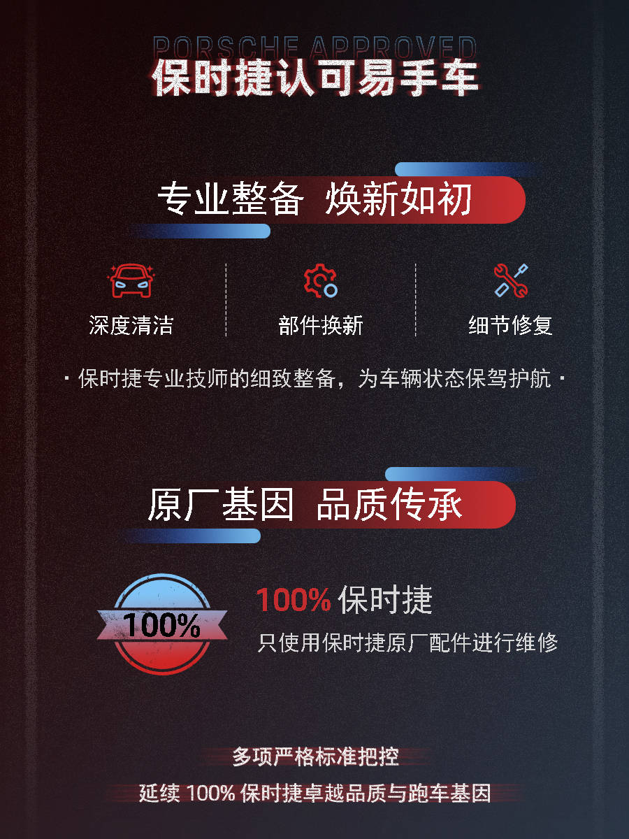 保时捷认可易手车不仅延续了品牌的卓越基因,更成为“经典与品质”的完美传承。每一台官方认证的车辆都必须经过涵盖六大维度的111项严格检测,确保车辆性能符合高标准。在整备环节,保时捷专业技师会对车辆进行全面检查和细致整备,使其恢复至最佳状态。维修过程中,保时捷严格遵循品牌标准,坚持只使用原厂配件,保证每一台车辆都是血统纯正的保时捷跑车。易手车用户还可以选购至少12个月的保时捷认可保修和救援服务,保时捷金融服务也提供量身定制的融资和租赁方案,让消费者尽享媲美新车的购车用车体验。
