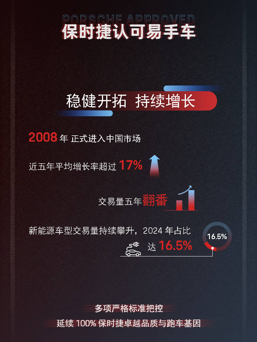 作为中国易手车市场早期布局的豪华品牌之一,保时捷自2008年便将认可易手车业务引入中国。凭借对品质的极致追求和严苛的检测标准,保时捷易手车业务规模迅速扩大,服务网络现已覆盖全国98%以上的核心城市。数据显示,过去五年间,保时捷中国易手车业务年均增长率超过17%,交易量实现翻倍。尤为随着保时捷电动化战略的推进,新能源车型在易手车市场的表现尤为亮眼,2024年占比已提升至16.5%,这充分证明了市场对保时捷新能源产品保值能力的高度认可。