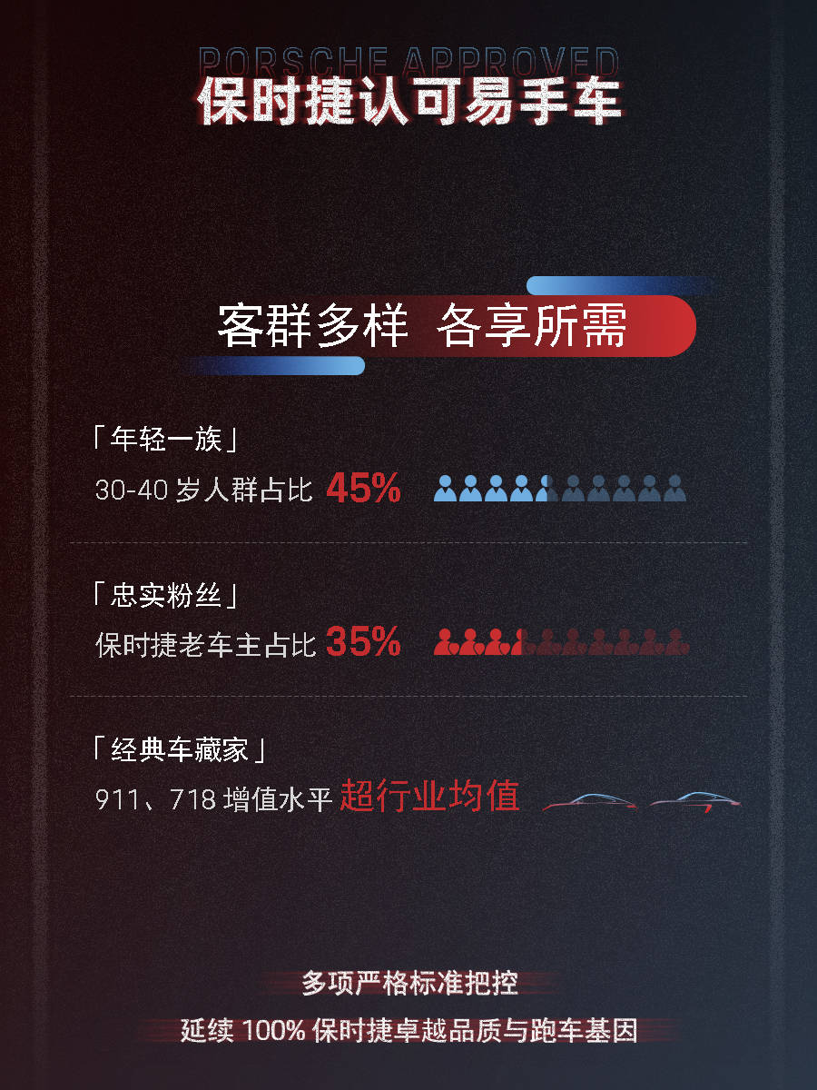 保时捷易手车市场用户群体呈现多元化特征。年轻消费者占比接近半数,其中近60%的首次购车者选择保时捷易手车作为他们的“人生第一台保时捷”。同时,相当比例的用户是保时捷品牌的忠实拥趸,他们通过置换升级至更高性能的车型。保时捷经典车型如911、718等在易手车市场的保值水平远超行业均值,持续吸引着资深玩家与收藏家的关注。这一多元化的用户结构不仅反映了中国消费者对保时捷品牌的高度认同,也彰显了保时捷易手车在不同细分市场的独特吸引力。